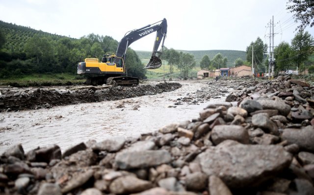 8月18日,挖掘机在青海省西宁市大通回族土族自治县青山乡沙岱村疏通河道。新华社记者 周盛盛 摄