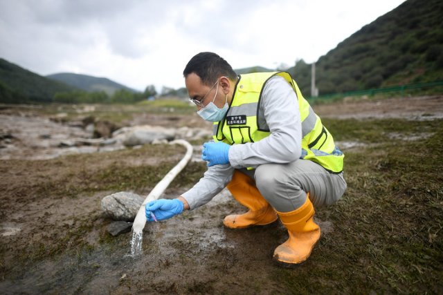 8月18日,西宁市生态环境监测站工作人员在青海省西宁市大通回族土族自治县青山乡沙岱村监测水源水质。新华社记者 张宏祥 摄